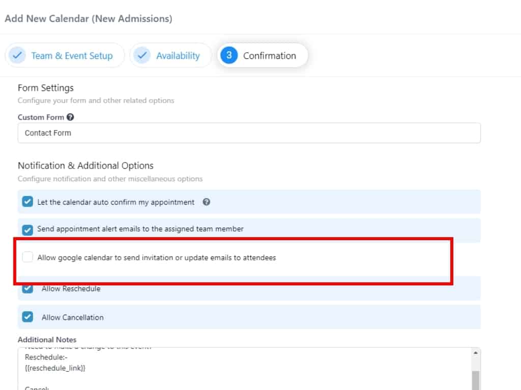 If this next option is checked, Google Calendar will send invitations or update emails to appointment attendees. As before, you can also leave this unchecked and use triggers for a more customized solution.