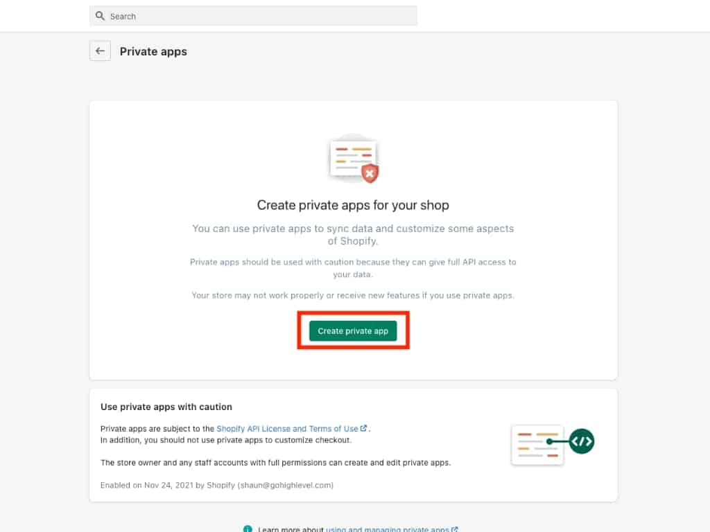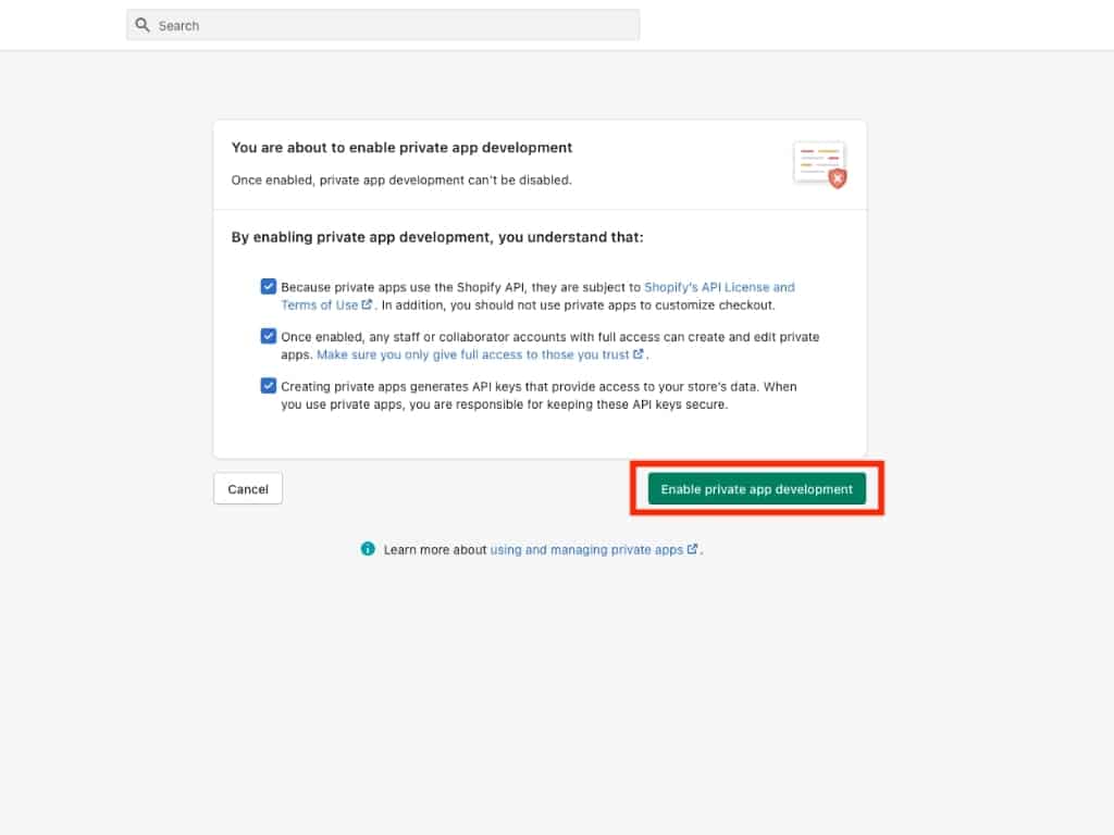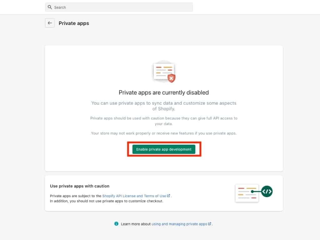 However, if you don’t have an app set up, then you’ll need to enable private app development. Click the Enable private app development button.