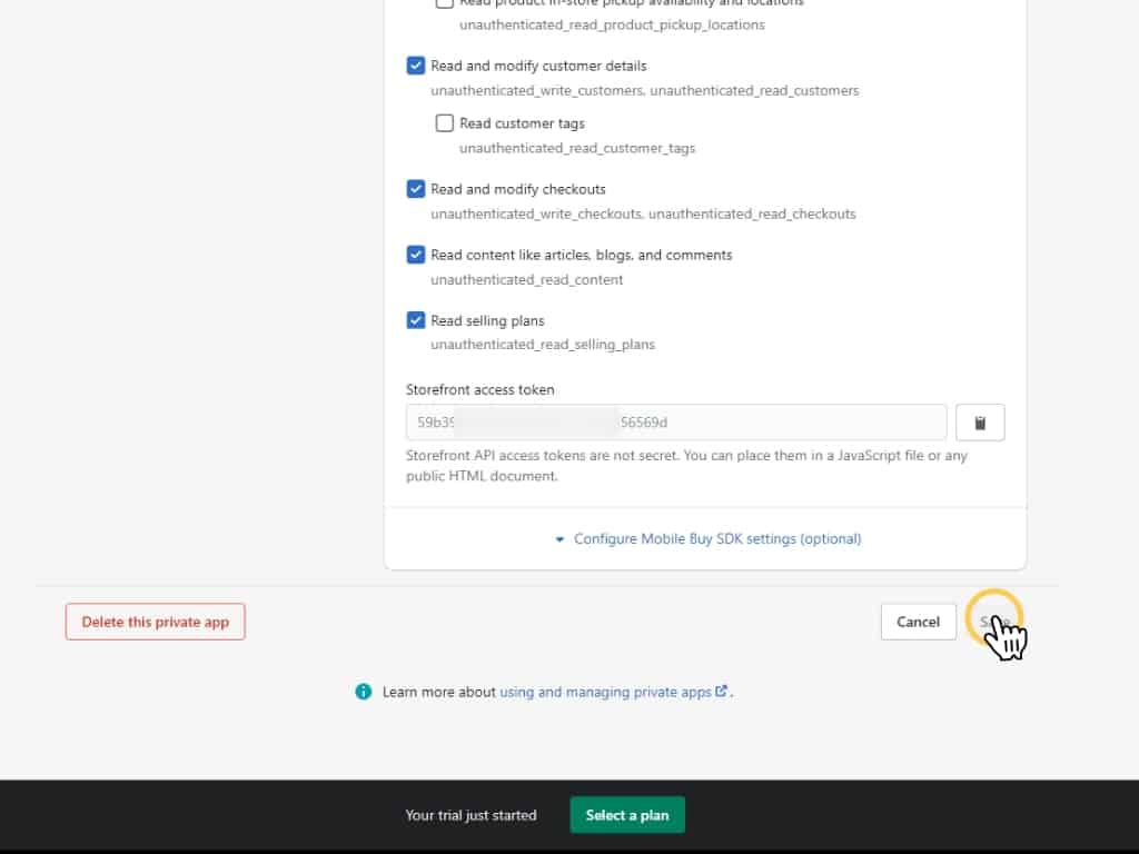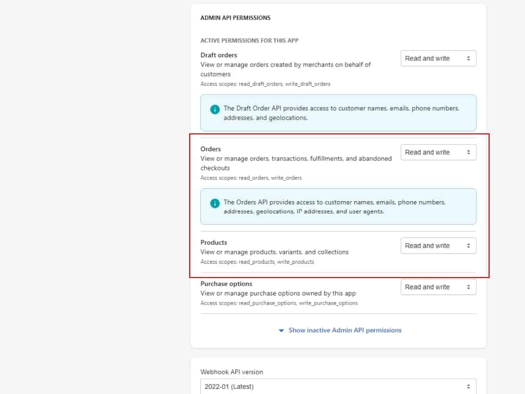 For proper integration, you will also need to provide at least “Read” access permission for Products and Orders specifically. You can also select “Read and write.”