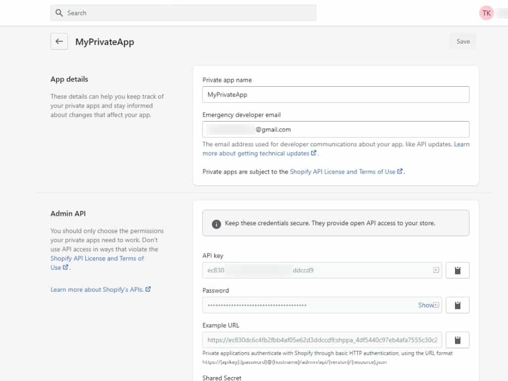 The admin API credentials will be created, which we’ll need to integrate it with your CRM. On the Shopify page, copy your App password.