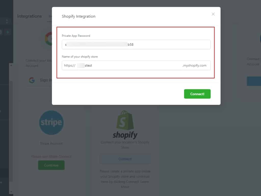 In the pop-up, paste your Private app password and enter your Shopify store’s name in the next field.