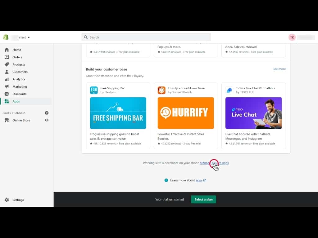 On the Apps page, scroll down, and then click Manage Private Apps.