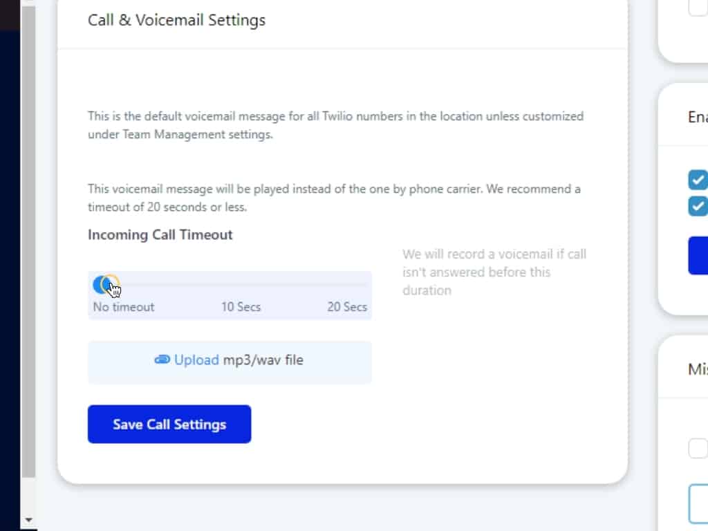 Scrolling down, you’ll find your call and voicemail settings. Here, you’ll set the incoming call timeout according to your preference. When you receive a call, your platform will wait this long before playing your recorded message.