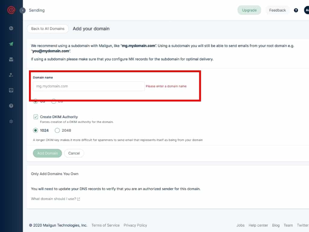 While configuring your domain, it's highly recommended to use a subdomain, such as replies.yourdomain.com or response.yourdomain.com. Enter your complete domain (including the subdomain) in the field provided.