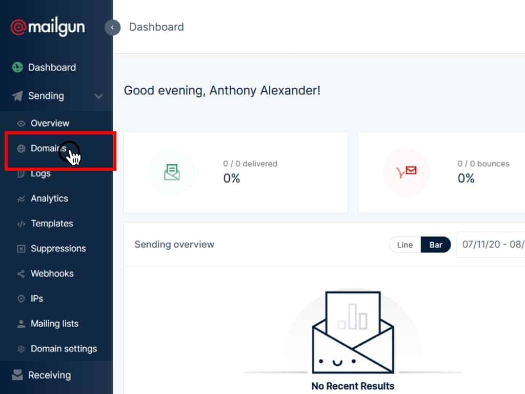 To start, log in to Mailgun. When you open your account, it will take you to your Dashboard.