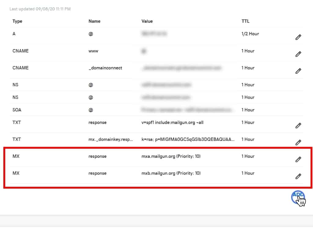 This opens a DNS management page. Click Add at the bottom to insert a new DNS record.