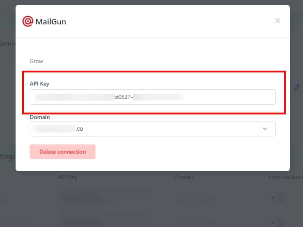 This will open a pop-up where you can paste your Mailgun Private API key in the appropriate field.