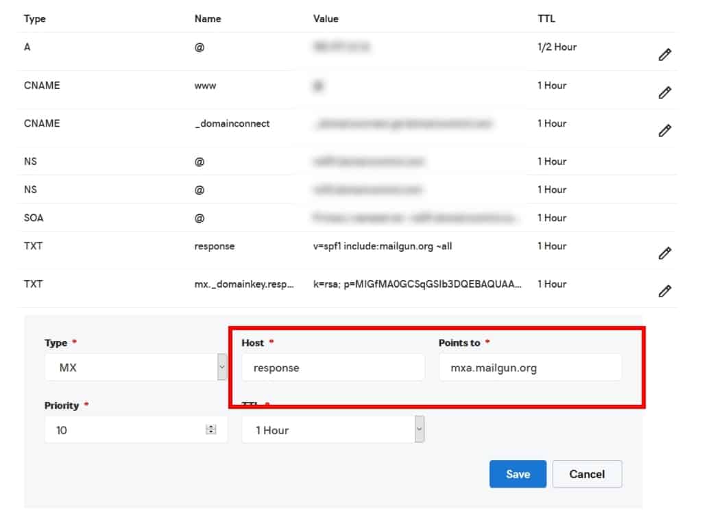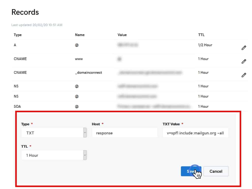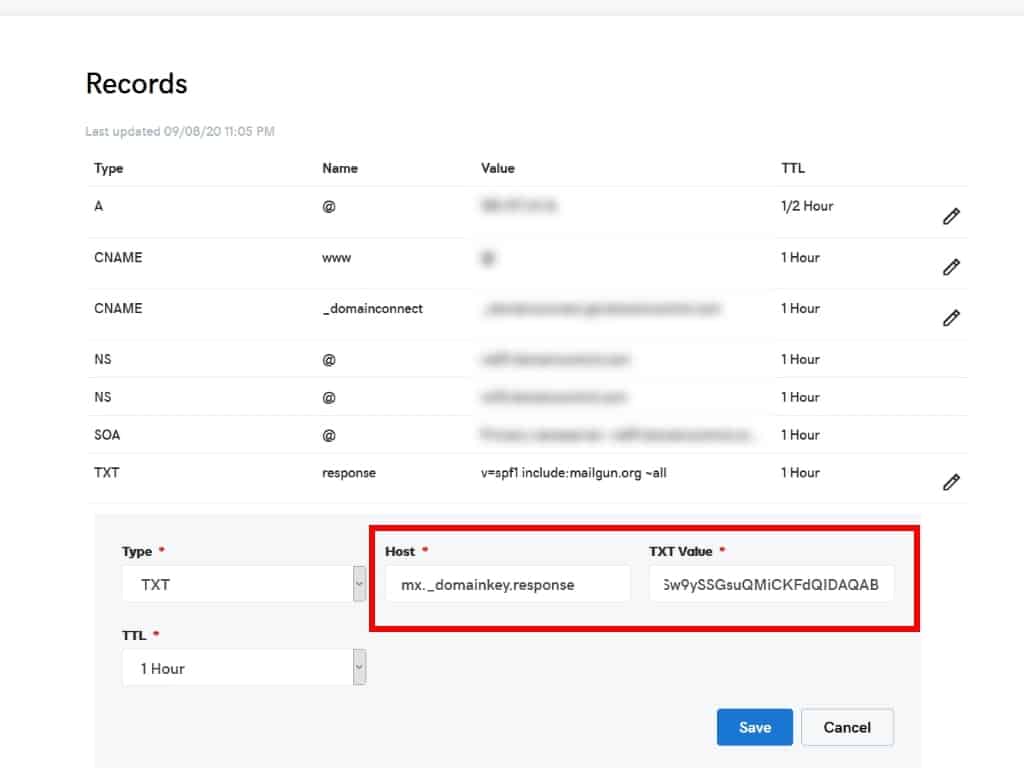 We can leave the TTL field at its default value, but we'll need to enter information for the Host and TXT Value. These can be copied and pasted from your Mailgun tab.
