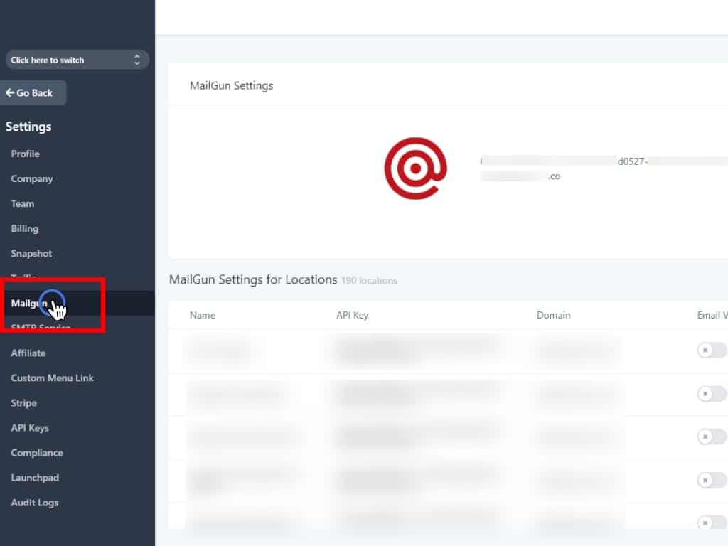 Now, switch back to your platform and click Settings on the left menu. Then, click Mailgun on the new left menu that appears.