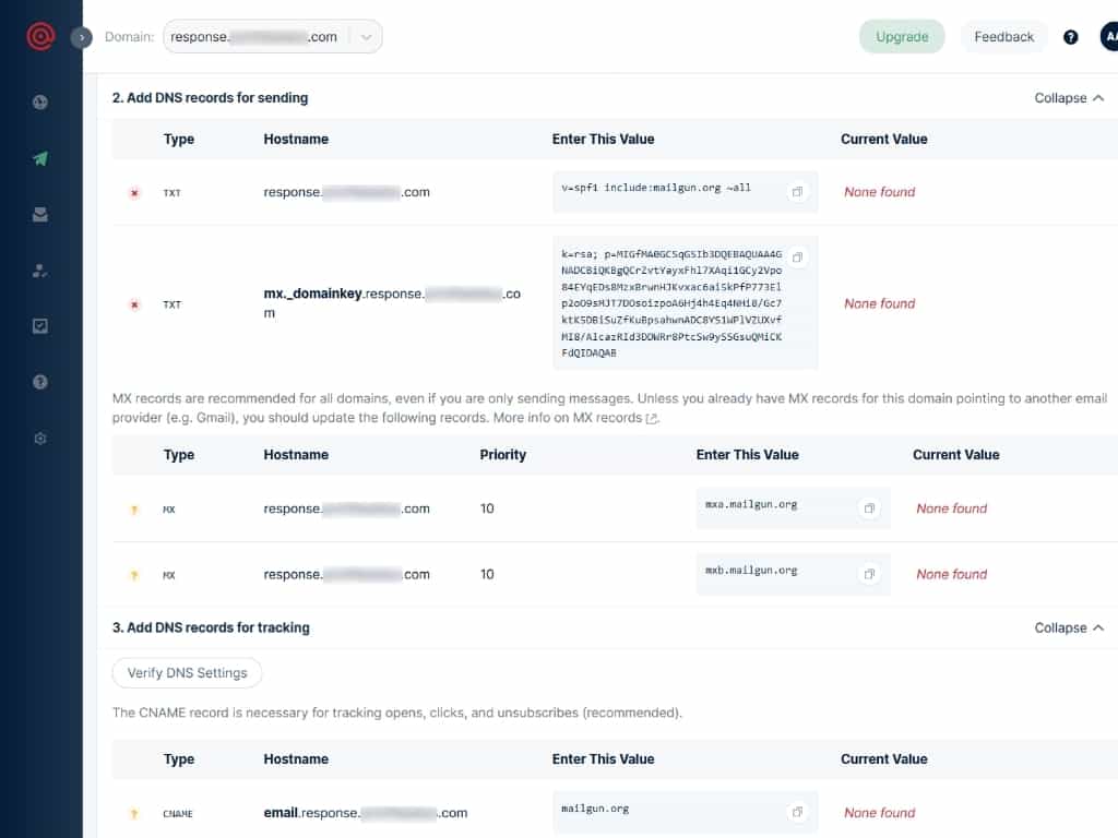 While configuring your domain, it's highly recommended to use a subdomain, such as replies.yourdomain.com or response.yourdomain.com. Enter your complete domain (including the subdomain) in the field provided.