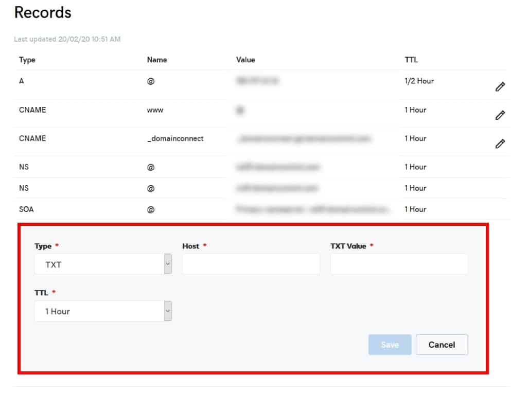 The next record we’ll need to add is also a TXT record. For this one, you’ll click Add and select TXT again, but the Hostname will be different.