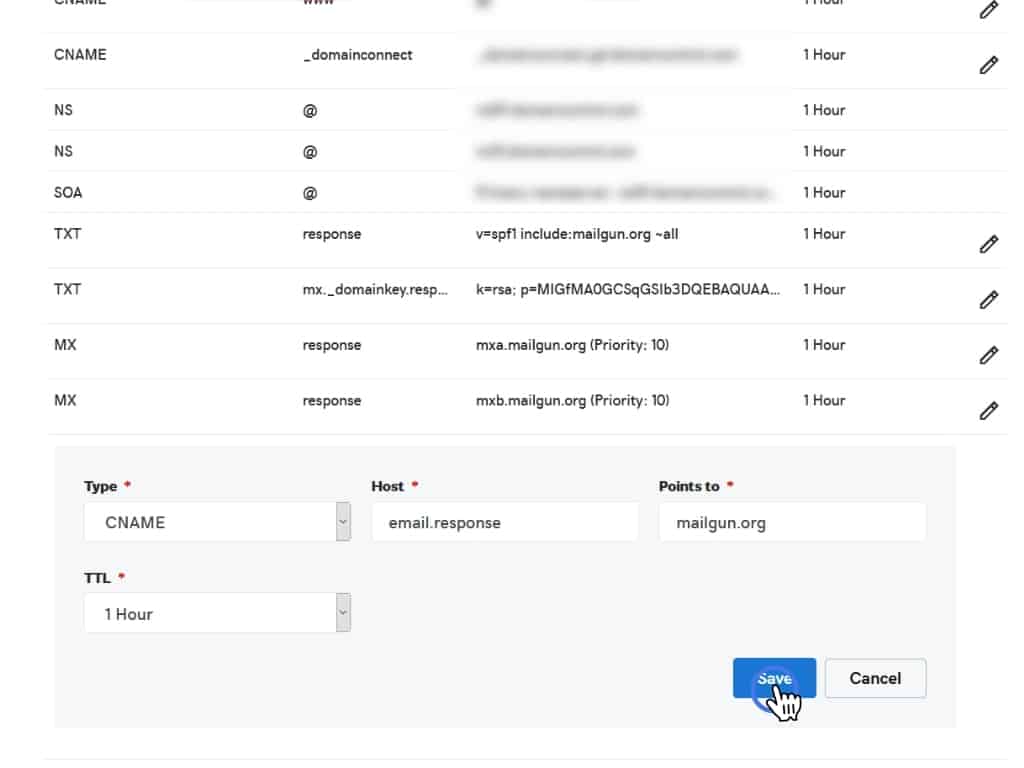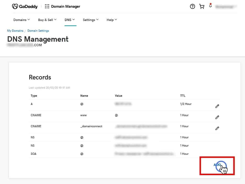 This opens a DNS management page. Click Add at the bottom to insert a new DNS record.