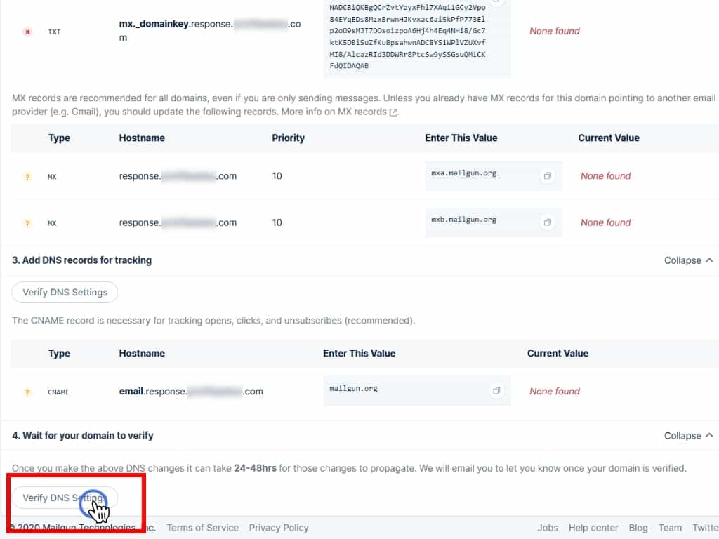 At the bottom of your Mailgun domain settings page, click Verify DNS Settings.