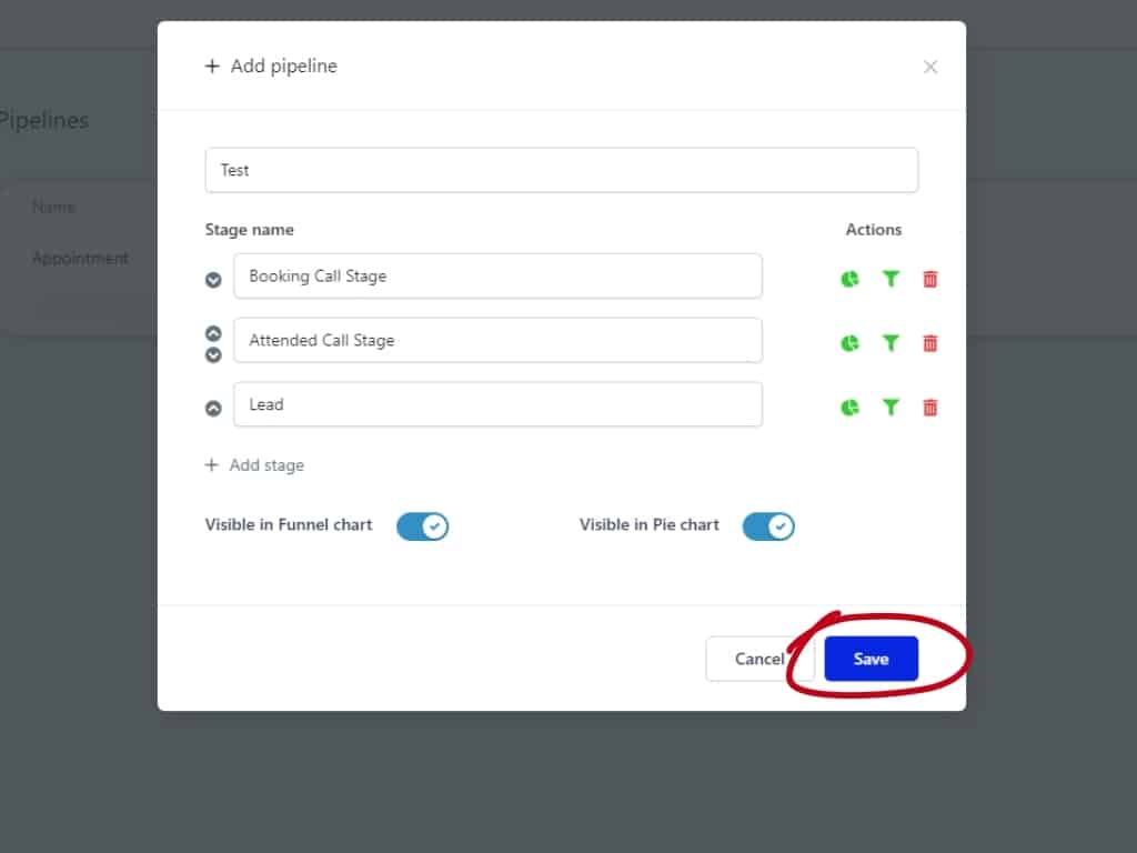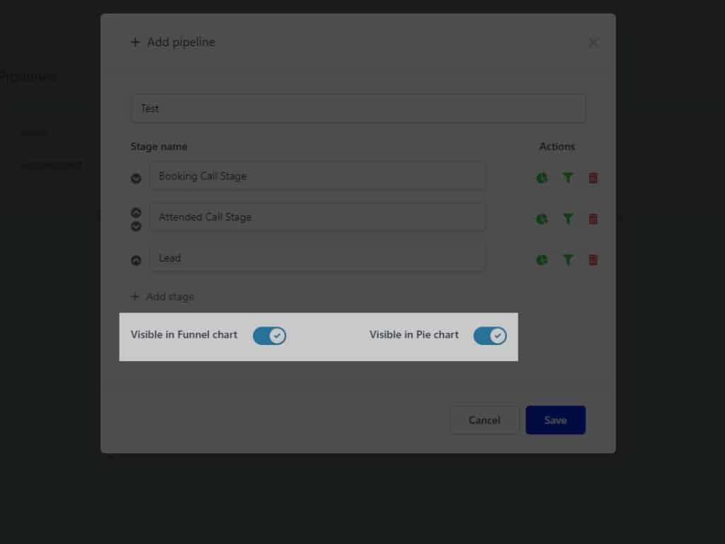 At the bottom, you'll see two options. Enable these toggles if you’d like the Pipeline you're creating to be visible in funnel and pie charts.