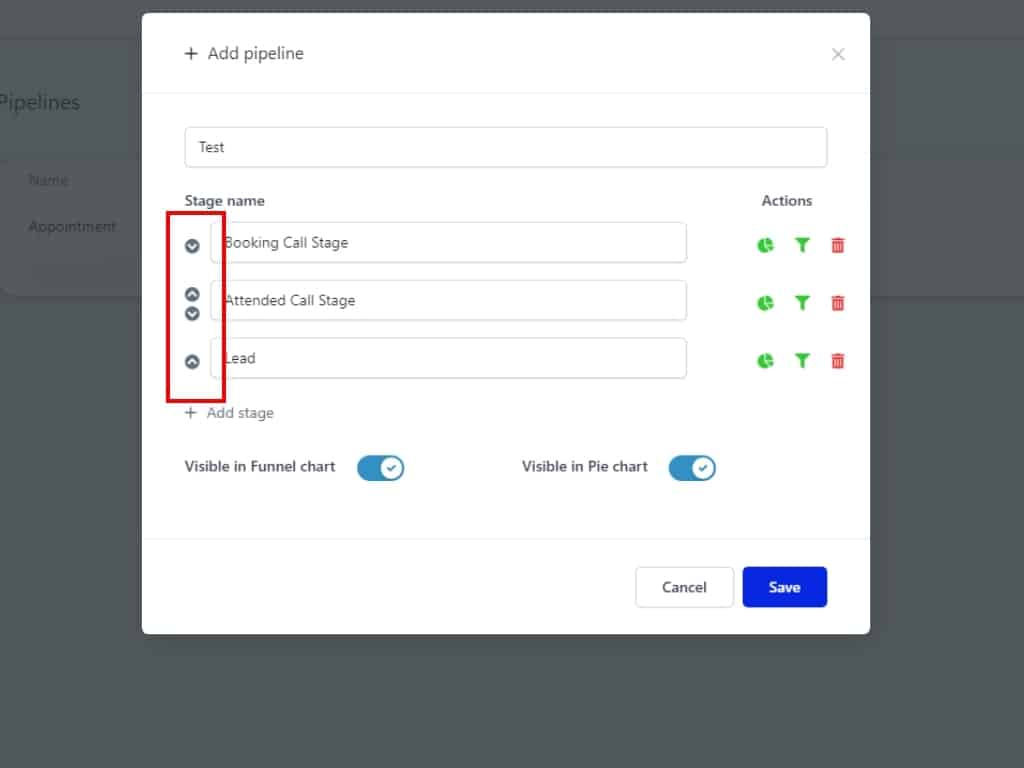 The arrows on the left side of the individual Stage fields can be used to change the order of Stages. Simply click up or down to move a Stage one space higher or lower.