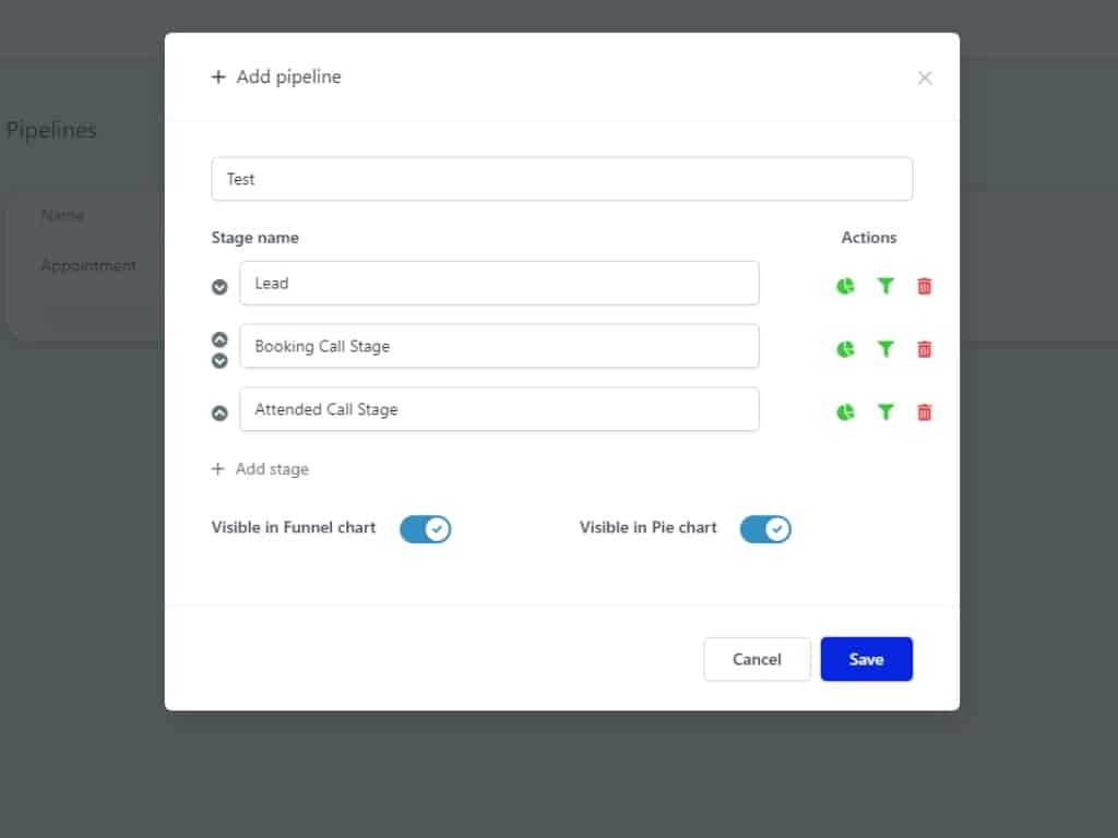 Like a traditional sales process, your platform uses Pipelines to create a structure for your prospects. Each Pipeline has Stages, such as Lead, Booked Call, or others that describe where they are at in the sales process.