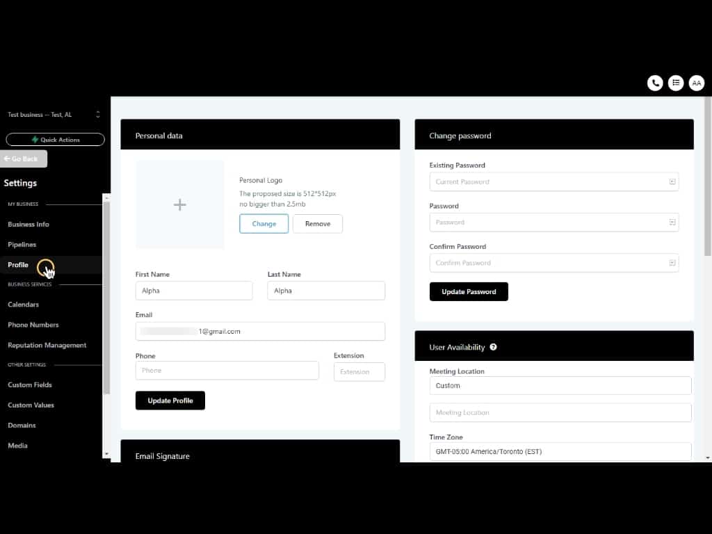 In the left column, you can upload a new logo or change your existing one. In addition, you have a personal details area for your name, email address, and phone number.