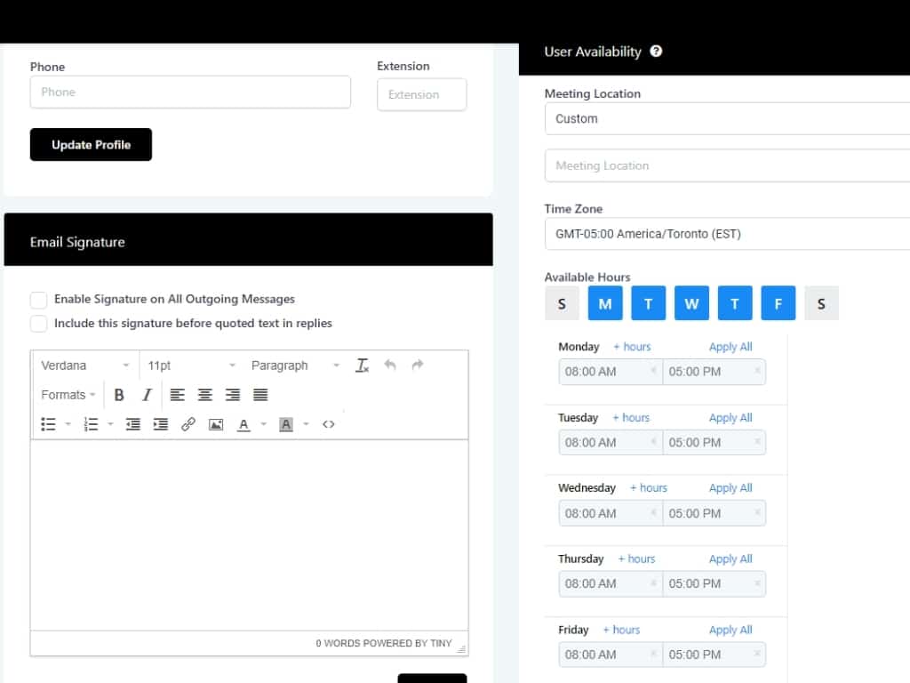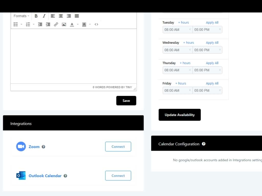User Availability is the setting you’ll use to specify your working days and hours as well as other information. In the Meeting Location field, you can choose between Zoom and Google Meet as your preferred location.