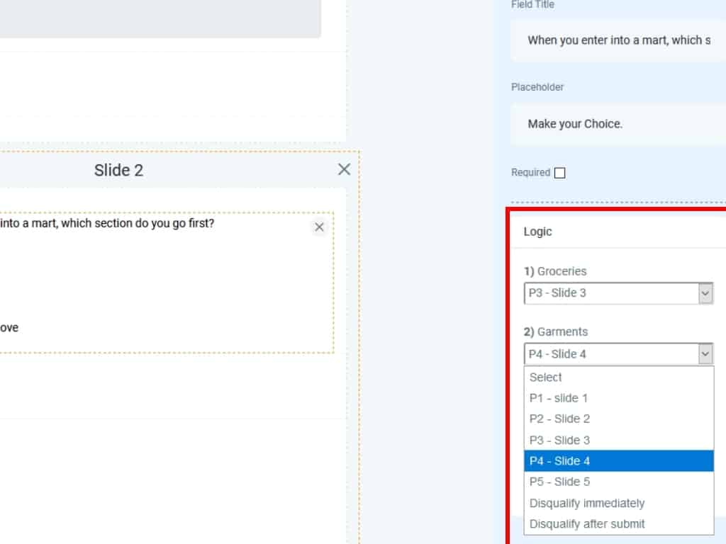 This brings up a list of options including all your slides as well as two disqualify options. When you choose one of these options, the user will be moved to your selection after they choose Groceries. We'll select Slide 3.