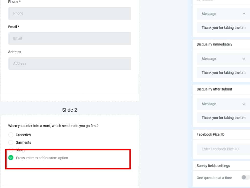 Like forms, you can use the On Submit section to display a message after your user has completed the survey or redirect them to a new URL.