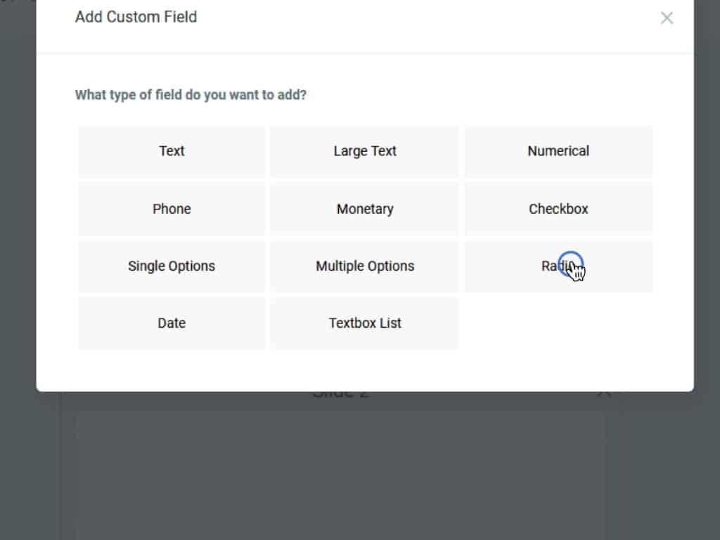 The first custom field we're going to create is a Radio element. Click Radio now.