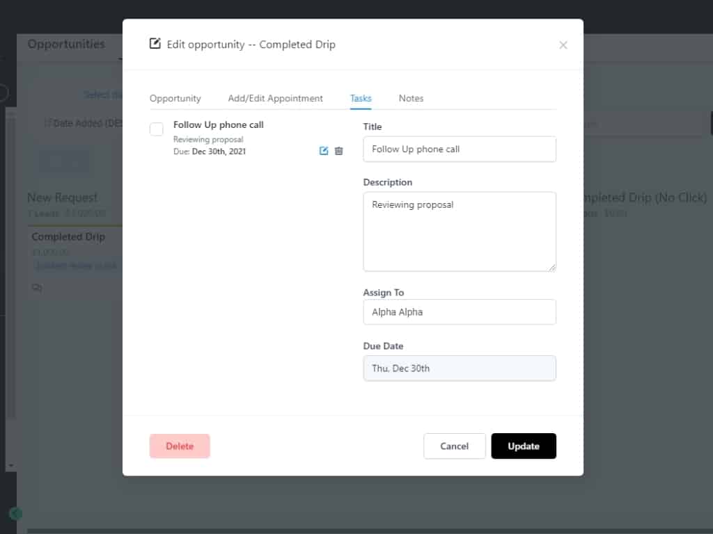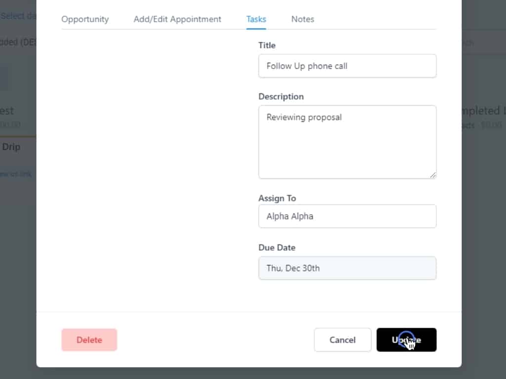 Here we can add a task name and description. Our task will be a follow-up phone call to review a proposal sent to the contact.