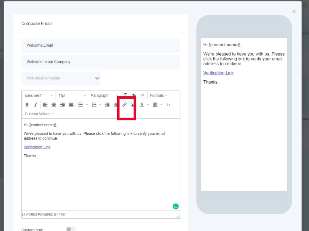 And this is the email we've composed that is sent when the contact submits the form. Note that the verification link is already added.