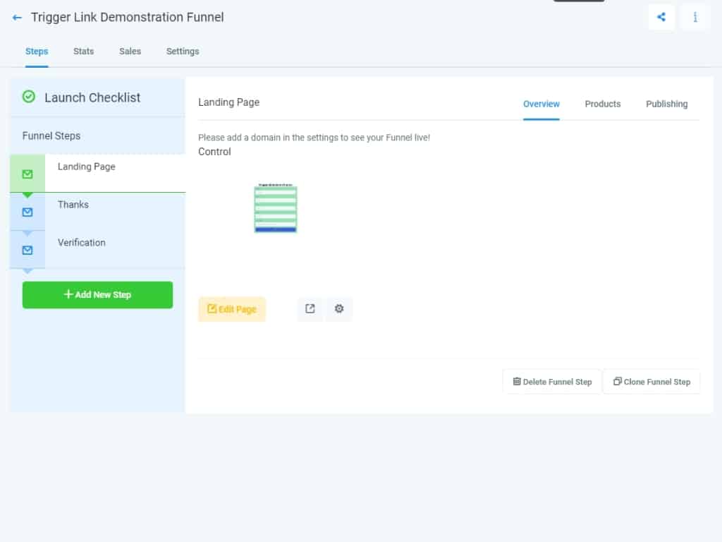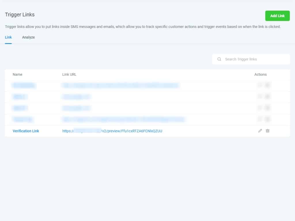 On our trigger links page, you can see the link I've previously created called Verification Link. This is the same link the contact clicked and it's connected to the third step of our funnel - the verification message.