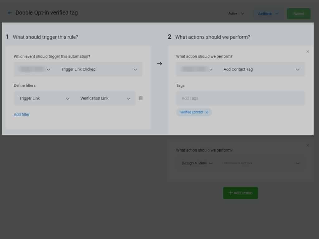 On the right side of the pop-up, we tell the rule what action to take when the Verification Link is clicked. For our example, our action is that we want to add a tag to the contact that says verified contact.