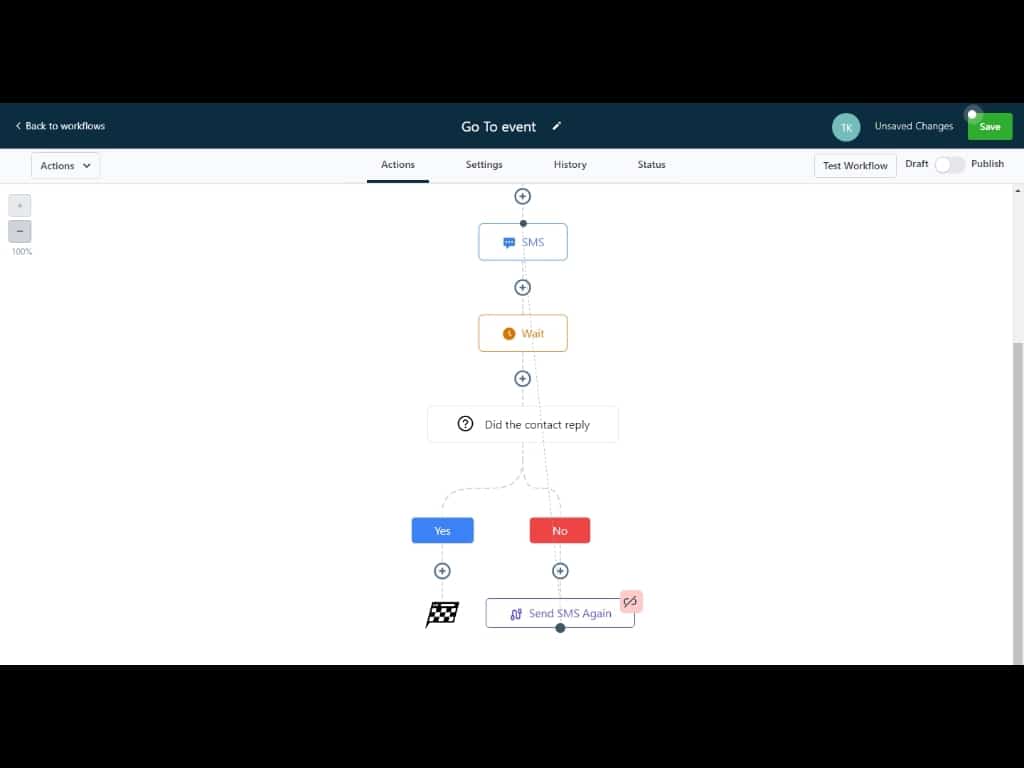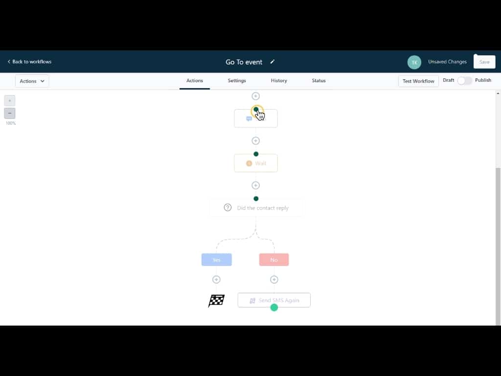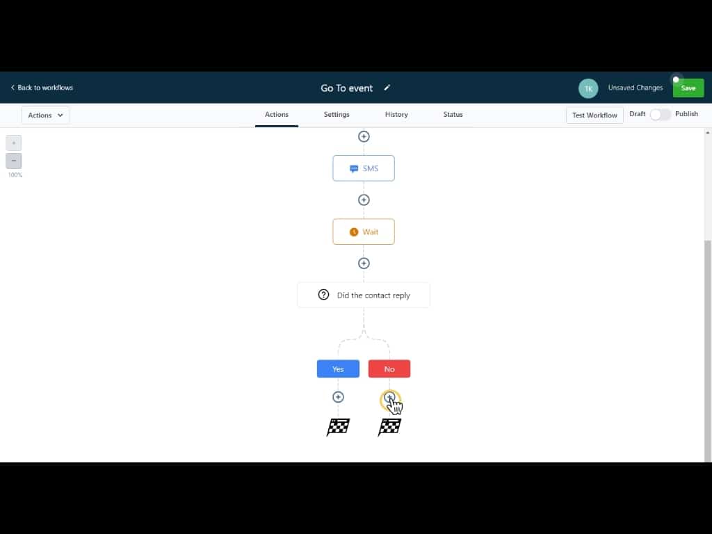 After the wait step, there is an If event set up where the path a contact takes through the workflow is determined by whether they have responded to the SMS or not. If so (“Yes”), they exit the workflow. If not, they pass through the “No” step.