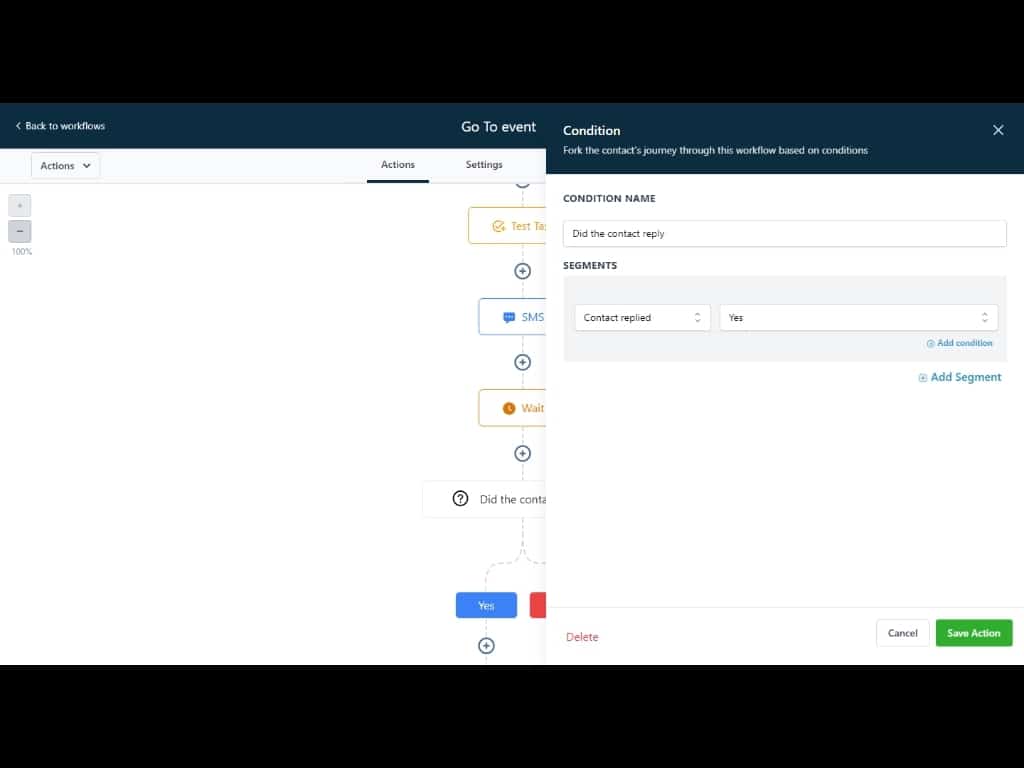And then a wait step with the condition of waiting for 5 minutes or until the contact replies to the SMS, whichever comes first.